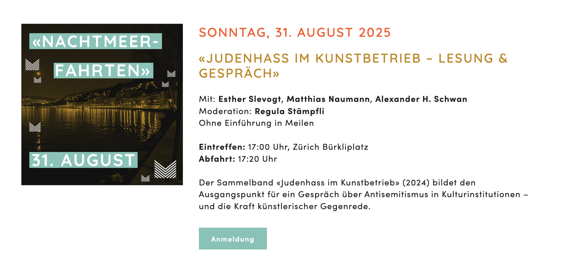 Der Sammelband “Judenhass im Kunstbetrieb”, HG von M. Naumann bildet den Ausgangspunkt für unsere Gespräche zum Antisemitismus in Kulturinstitutionen und die Kraft der künstlerischen Gegenrede. Die Nachtmeerfahrten der vorangegangenen Wochen brachten die unterschiedlichsten Menschen zusammen – so auch am 31. August wo die Politphilosophin laStaempfli durch den Abend führt. Grosse Buchkauf-Empfehlung des Buches: Judenhass im Kunstbetrieb. Anmeldung unter https://www.maison-du-futur.ch/nachtmeerfahrten-2025.