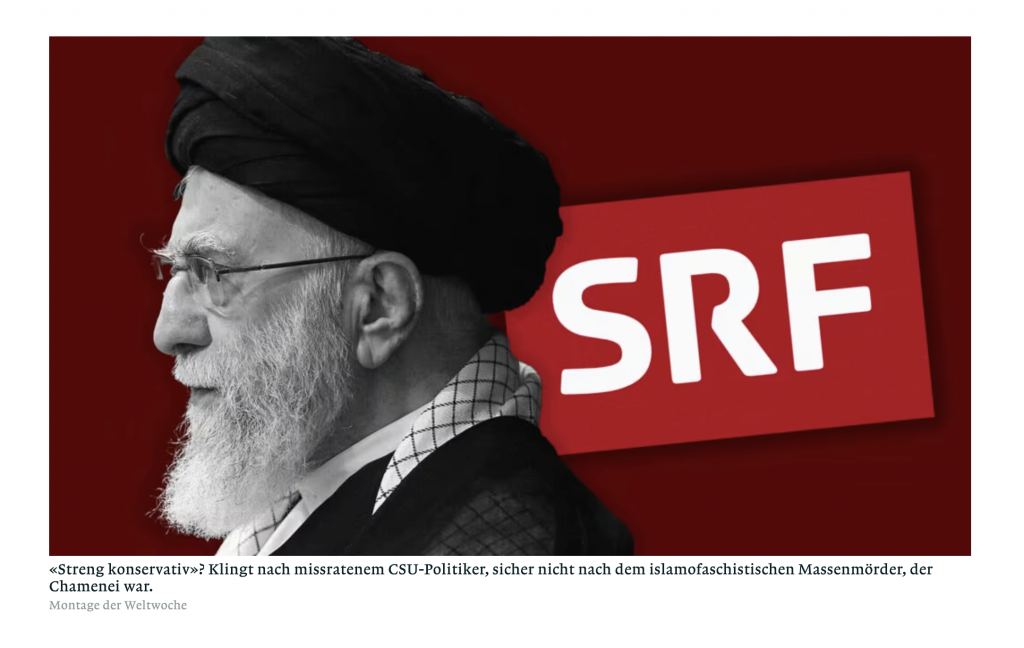 “Ein bemerkenswerter Doppelakt 2024: Die SRF-Nahostkorrespondentin Susanne Brunner wird «Journalistin des Jahres» – nachdem die Ombudsstelle sie im selben Jahr mehrmals rügen musste. Die SRG ist voller Judenhasser, die neudeutsch «Israel-Kritiker» heissen. Terroristen wie Sinwar oder Nasrallah wurden von SRF gewürdigt wie Nobelpreisträger: «Hassan Nasrallah: Sein Leben, sein Wirken und sein Vermächtnis.» Hamas- und Hisbollah-Kuschler sind im Leutschenbach nicht nur zahlreich – sie lassen es das ganze Haus wissen, dass sie zu den Guten gehören. Stefan Renna von RTS beschimpfte live das israelische Bobfahrerteam antisemitisch. RTS nahm ihn in Schutz. Die internationale Presse überschlug sich – SRF wollte darüber nicht einmal berichten. Wetten, dass Stefan Renna, ähnlich wie Brunner, Ende 2026 ausgezeichnet wird? Zu diesen Hamas-Kuschlern stellen sich neu die Mullah-Versteher beim Service public. Am 28. Februar 2026 titelt SRF: «USA greifen Iran an.» Klingt doch neutral, oder? Ha: Das Framing ist dann super. «Schweiz und Norwegen pochen auf Einhaltung des Völkerrechts.» Volker Türk, sonst stumm wie ein Fisch, wenn es ums Massenmorden des Regimes an der eigenen Zivilbevölkerung geht, sorgt sich um die Zivilisten. Kein Wort über Hunderttausende Iraner auf der Strasse. Kein Wort über Frauen, die für Freiheit sterben. Kein Wort über Massenhinrichtungen, Zwangsverschleierung, organisierte Massenvergewaltigungen. Streng «konservativ» sei beispielsweise Ali Chamenei gewesen. Streng konservativ? Klingt nach missratenem CSU-Politiker, sicher nicht nach dem islamofaschistischen Massenmörder, der Chamenei war. Und die Opfer des islamischen Terrors? Bei SRF eine Fussnote.
