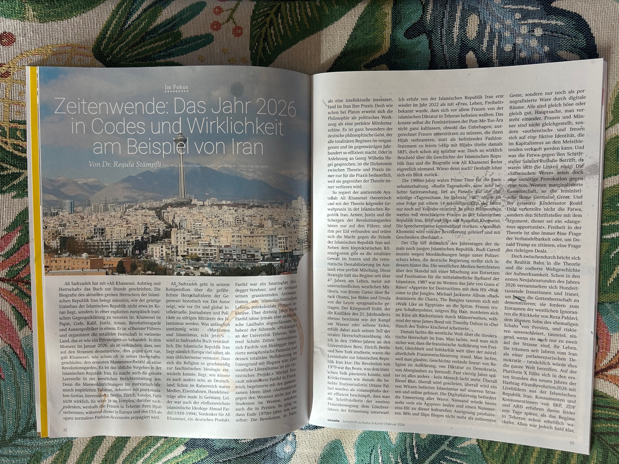 Die Politphilosophin, langjährige Leiterin der Ausbildung für Journalistinnen und Journalisten in Politik und Auslandjournalismus, beschreibt, wie es zum Aufstieg von Khamenei in der islamischen Republik Iran kam und wie der Iran sich in ein totalitäres theokratisches System mit systematischen Frauenhass entwickelt hat und wie die Linken im 21. Jahrhundert (und auch schon vorher), die Schreckensherrschaft der Mullahs aus revolutionären und postkolonialen Gründen legitimieren. Dies geht soweit, dass die sog. progressive Linke im Januar 2026 nach jahrelangem “Genozid”-Geschwafel und den Lügen darüber, zum Massenmord der Mullahs an der iranischen Bevölkerung kein Wort sagte. Regula Stämpfli wird, sobald der Artikel im PDF vorhanden ist, den Essay aufschalten – ansonsten verweist sie auf den Kioskverkauf von Ensuite oder auf Museeumscafés, da liegt Ensuite meistens gratis offen. “Seit Hannah Arendt wissen wir viel über totalitäre Systeme. Die grösste Gefahr für die Fragilität der Menschen ist dabei nicht nur die Gewalt, auch nicht das ständige Lügen, sondern das organisierte Sprechen. Totalitarismus ist nämlich eine Technik, die durch Erzählung, Fiktion, Wortwahl, Leerstellen, Menschen zur Verhandlungsmasse einer Ideologie erklärt. Und zwar so, dass nicht mehr zwischen Wahr- und Wahrlügen unterschieden werden kann.” Zitat, copyright von PD Dr. Regula Staempfli.